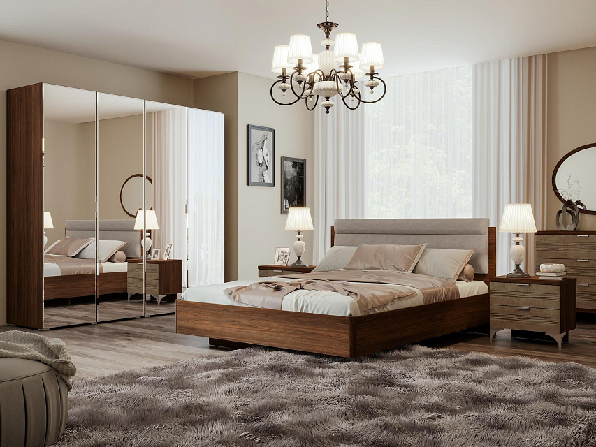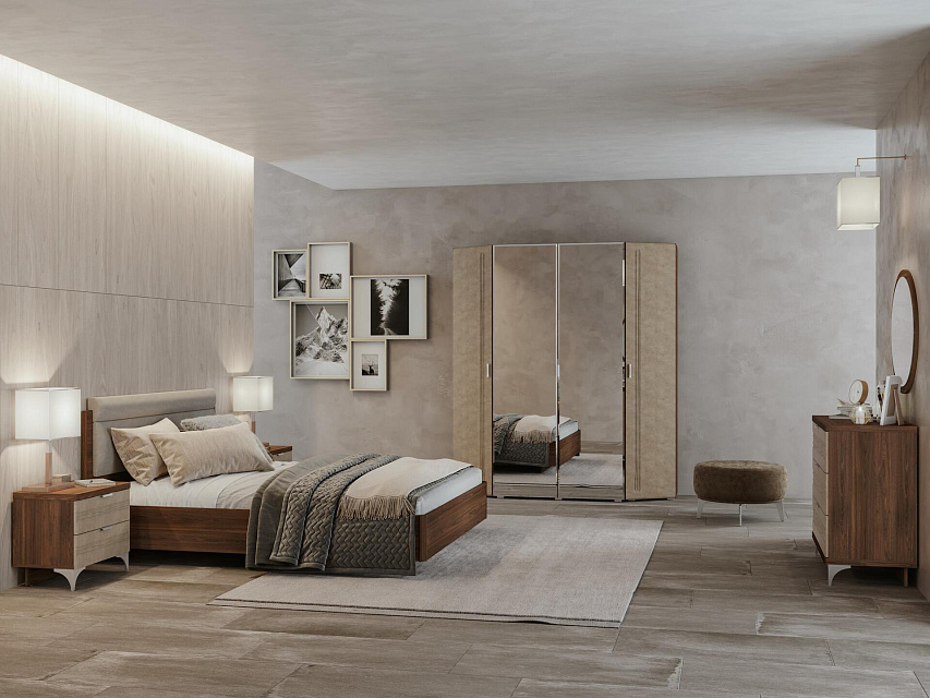 Материал корпуса - ЛДСП 16 мм. Задняя стенка выполнена из ХДФ, при этом в комодах, тумбах и ящиках она вставляется в паз. Выдвижные ящики снабжены шариковыми направляющими полного выдвижения. Тумбы и комоды комплектуются декоративными опорами 110 мм, а распашные шкафы - регулируемыми опорами L-20. Фрезерованные крышки комодов и тумб толщиной 32 мм облицованы кромкой ПВХ толщиной 1 мм.
