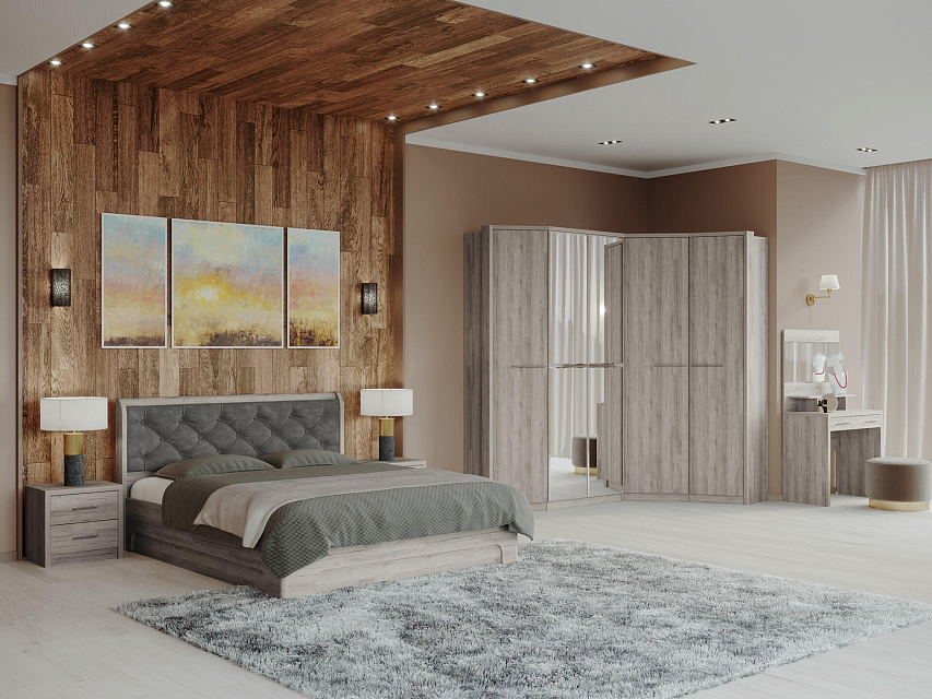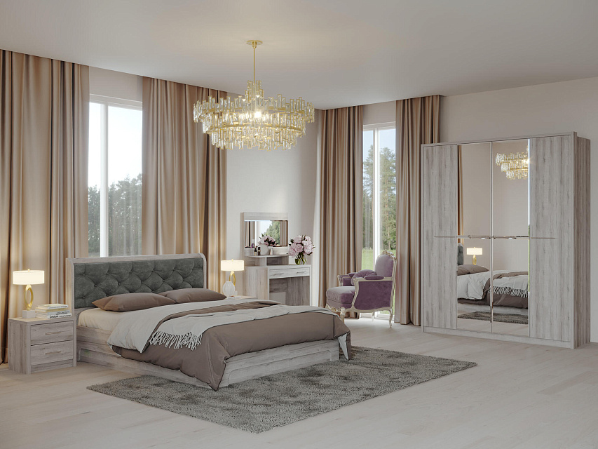 Корпус - ЛДСП 16 мм. В комодах и тумбах крышка толщиной 32 мм, направляющие полного выдвижения, задняя стенка из ХДФ в паз. Царги и изголовье кроватей выполнены из 32 плиты, на щитах кроватей используется каретная стяжка в стиле капитоне (ручная работа).