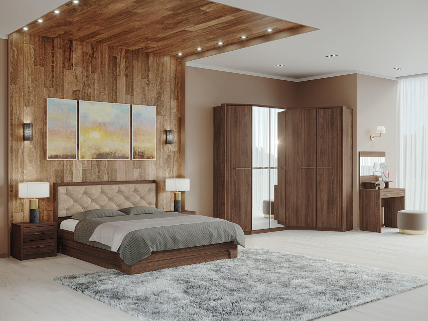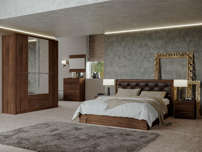 Корпус - ЛДСП 16 мм. В комодах и тумбах крышка толщиной 32 мм, направляющие полного выдвижения, задняя стенка из ХДФ в паз. Царги и изголовье кроватей выполнены из 32 плиты, на щитах кроватей используется каретная стяжка в стиле капитоне (ручная работа).