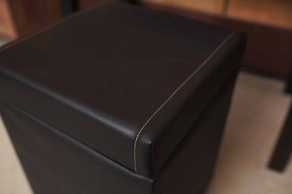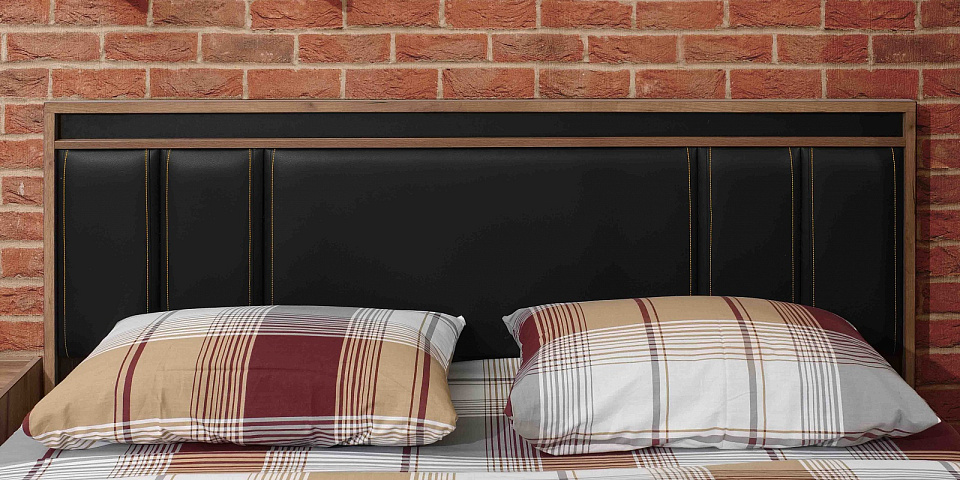 Изголовье в древесной раме, декоративная строчка золотой нитью на мягких подушечках кровати из черной экокожи - изюминка спальни, которая придаст комнате индивидуальности. Экокожа очень легко чистится и не выгорает под воздействием солнечных лучей.