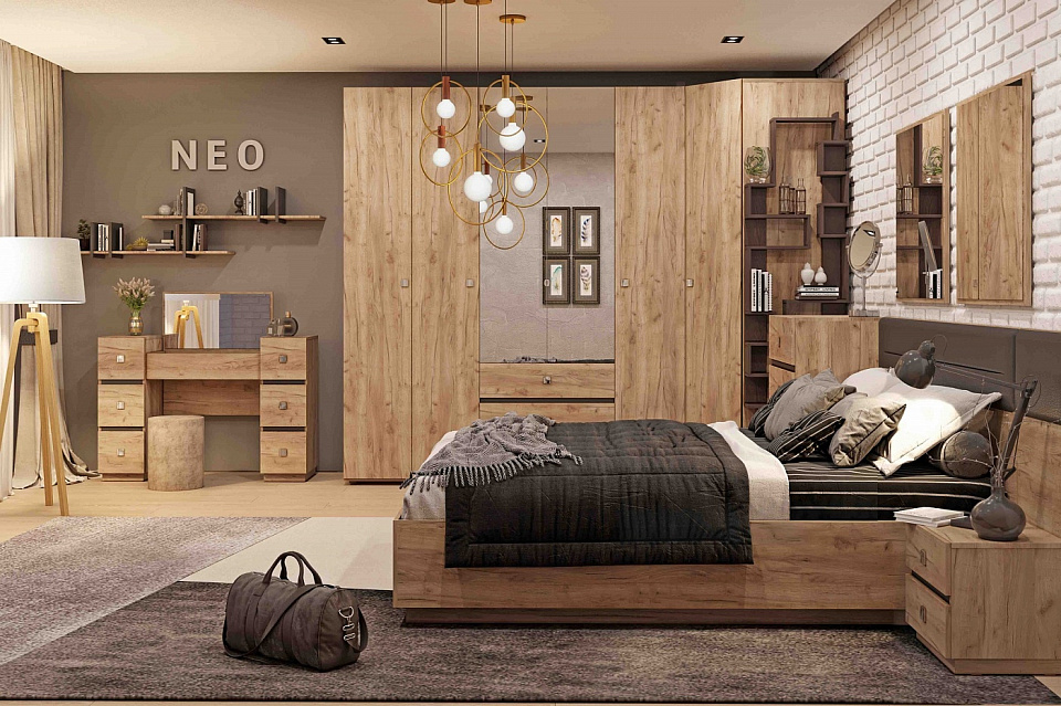 Благородный оттенок корпуса коллекции Neo с контрастной вставкой на изголовье кровати делают облик спальни строгим и одновременно элегантным. Мягкое изголовье в экокоже черного цвета позволит расслабиться в конце рабочего дня и с комфортом почитать перед сном.