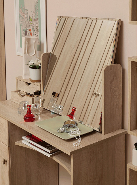 Бывает, что в маленькой спальне нет места для туалетного стола. Тогда используйте имеющиеся площади рационально: на высокий комод поставьте Трюмо с зеркалом и ящиками. Получится вариант для "быстрого" макияжа.