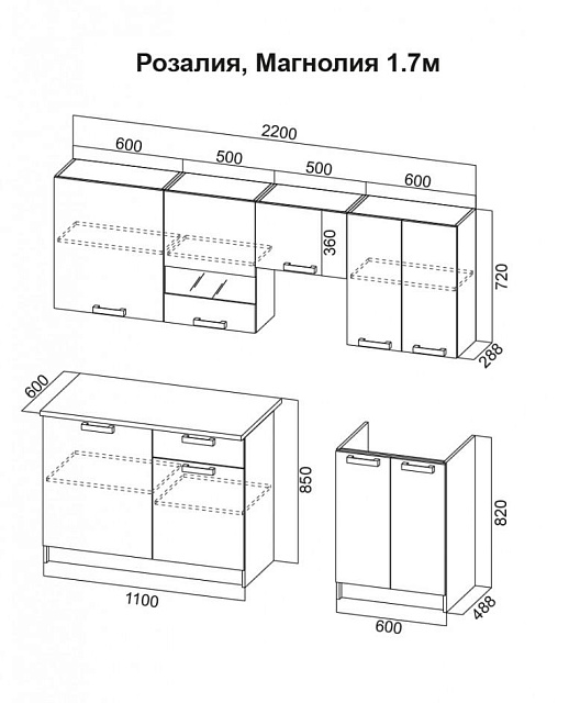 - Нижние модули по умолчанию комплектуются столешницей "Семолина" толщиной 26 мм. Исключение составляет стол под мойку, который рассчитан на использование накладной мойки и столешницей не комплектуется.