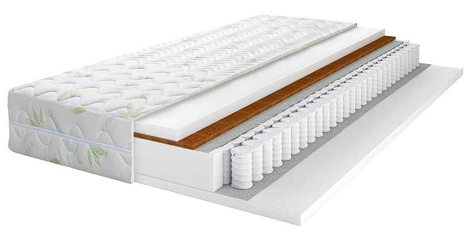 Кокосовая койра, Пенополиуретан, Блок независимых пружин, Чехол, Усиление по периметру матраса