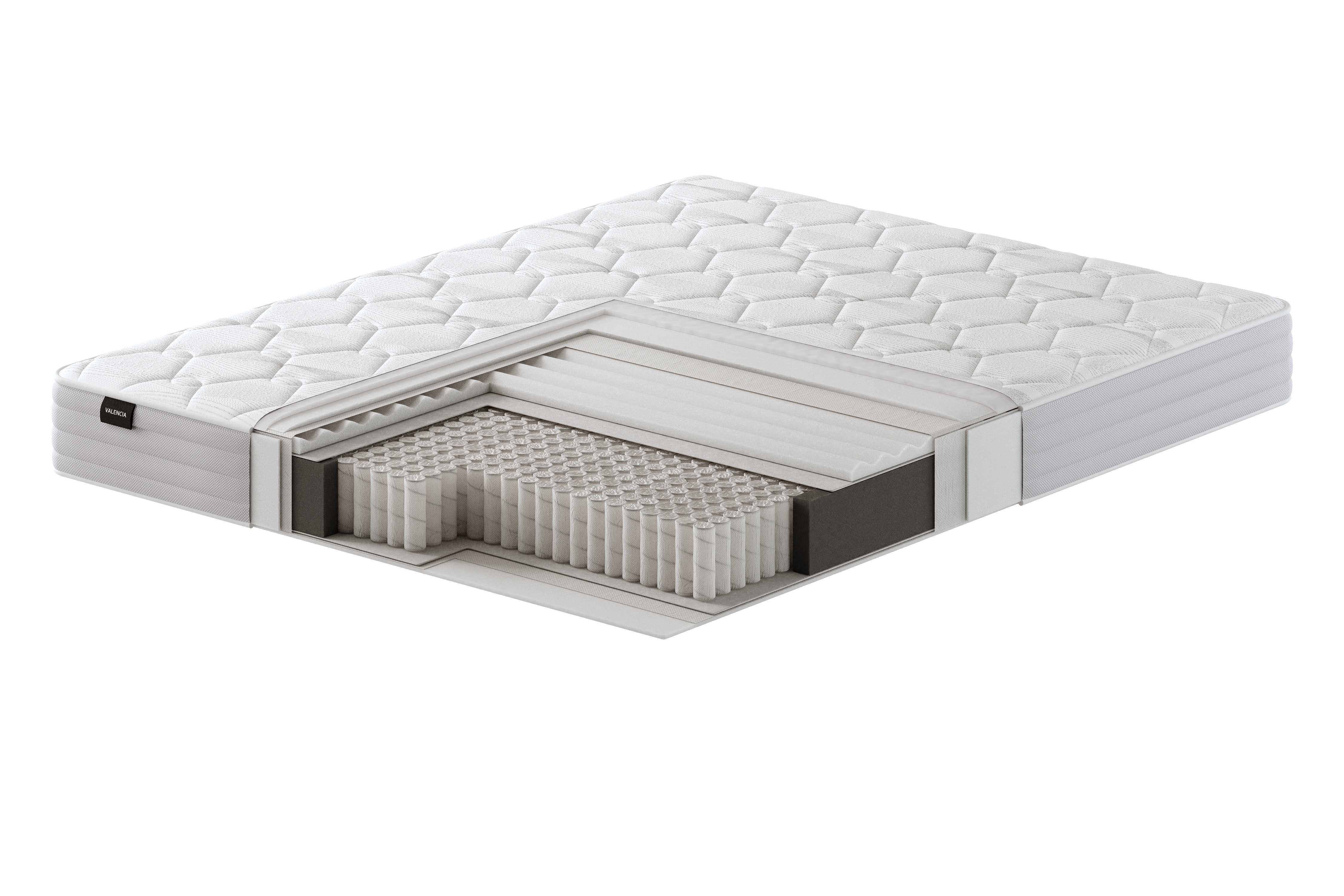Многослойная конструкция матраса сочетает мягкие и упругие пенные наполнители с контурной резкой для точечной поддержки и блок независимых пружин MULTIPOCKET, который адаптируется к телу и удерживает позвоночник в правильном положении. Холлкон и трикотаж обеспечивают гигиеничность изделия, а изолирующий слой Fiberterm и спанбел делают матрас бесшумным и долговечным.