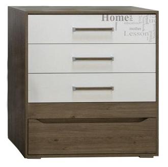 Комод "Гарвард" комплектуется четырьмя выдвижными ящиками. Три из них с накладками в цвете «Белый» и ручками. Четвертый ящик комплектуется накладкой в цвет корпуса с фрезеровкой вместо ручки.