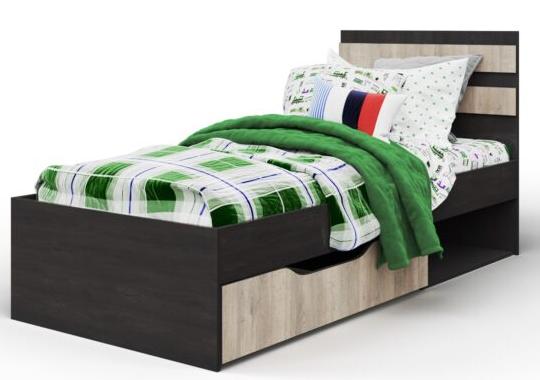 Головной щит и детали кровати, которые в эксплуатации подвержены механическим повреждениям, облицованы кромкой ПВХ толщиной 2 мм. Спальное место 1950*900 мм. Основание щитовое, в основании установлен ящик выкатной для постельного белья. Ящик может устанавливаться как справа, так и слева кровати.