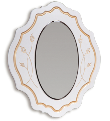 Скрытый тип навески. Изготовлено из МДФ плёночного и закрепленным к нему зеркалом толщиной 4 мм овальной формы с фацетом. Фасад декорирован золотой патиной с защитным водным покрытием.
