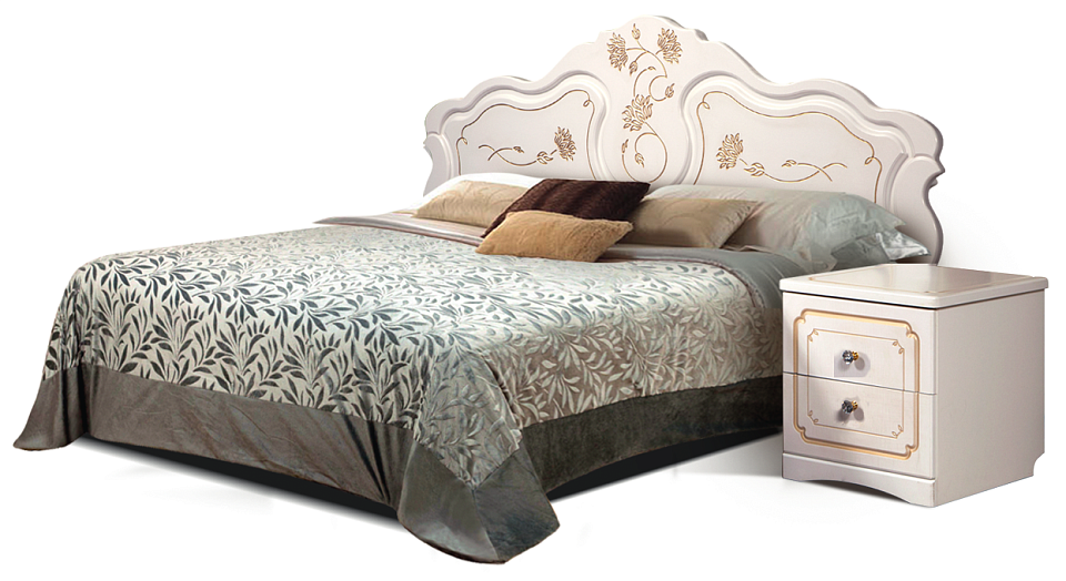 Детали кровати, которые в эксплуатации подвержены механическим повреждениям, облицованы кромкой ПВХ толщиной 2 мм. Основание щитовое усиленное тремя силовыми опорами. Головной щит декорирован золотой патиной с защитным водным покрытием.