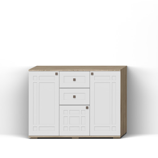 Ящики на шариковых направляющих, петли без доводчиков, задняя стенка изготовлена из ХДФ. При желании петли с доводчиками можно приобрести дополнительно и самостоятельно установить их. Фасад из МДФ плёночного с патинированием. Детали тумбы, которые в эксплуатации подвержены механическим повреждениям, облицованы кромкой ПВХ толщиной 2 мм. За дверями установлены съемные полки. Тумба установлена на опорах.