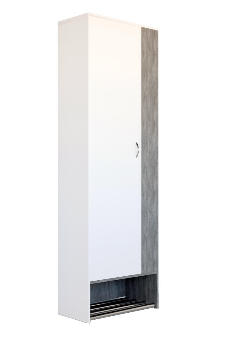 Неотъемлемым атрибутом прихожей является шкаф для верхней одежды. Вариант из коллекции Ривьера имеет компактные размеры и большую вместительность. Помимо основного отделения для вещей шкаф имеет нишу для хранения обуви. Она представлена металлическими трубками в цоколе изделия. Ниша не оборудована дверцей, что позволяет обуви быстрее высохнуть из-за свободной циркуляции воздуха. Шкаф выполнен из ЛДСП цвета белый экспо и бетон. Такое сочетание оттенков дополнит любой интерьер.