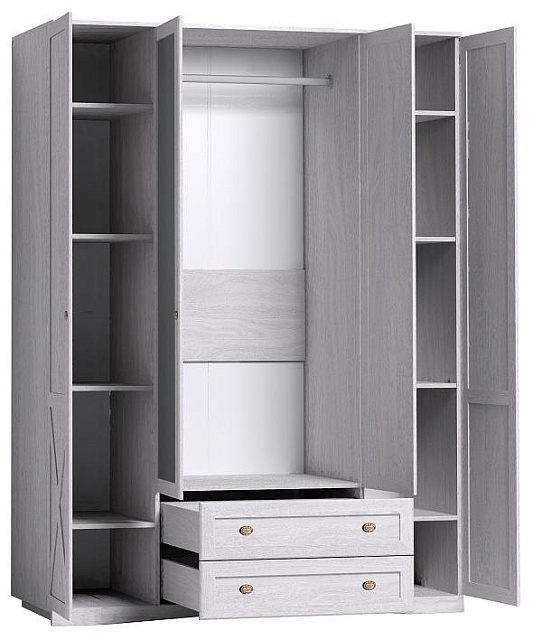 Вместительный 4-дверный шкаф для одежды и белья с продуманным наполнением - классический вариант шкафа для спальни. Он оснащен двумя отделениями для хранения белья с рядом полочек, выдвижными ящиками и отделением для одежды со стационарной штангой. Двери шкафа с зеркалами в обрамлении профиля и с декоративной раскладкой из МДФ станут настоящим украшением спальни. Зеркала проклеены специальной защитной пленкой – если они разобьются, осколки не разлетятся. Для декорирования шкафа используйте ADELE 51 Карниз, который докупается по желанию.
