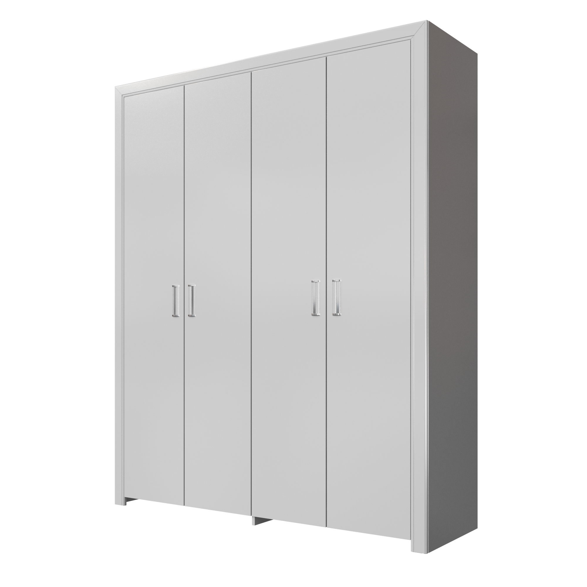Петли без доводчиков, задняя стенка изготовлена из ХДФ. В правой части шкафа за дверями три съемные, одна несъёмная полка и штанга для одежды, в левой части установлены две несъёмные полки и штанга для одежды. Детали конструкции фасада изготовлены из МДФ пленочного.