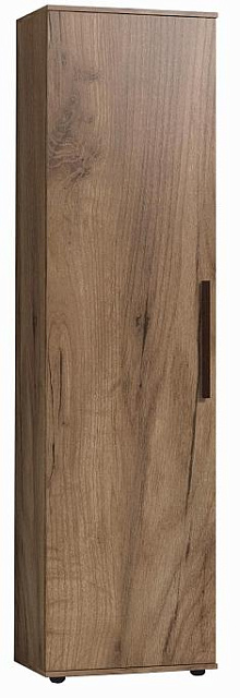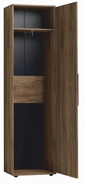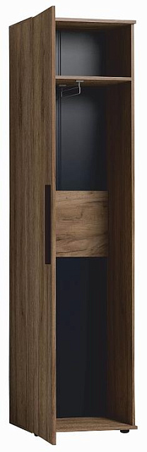 Распашной шкаф в декоре Дуб Табачный комплектуется штангой для одежды и полкой. Выдвижная штанга выдерживает нагрузку до 10 кг. К модулю Nature 71 можно докупить и установить полки (артикул 72) (в комплекте 3 полки) в заранее просверленные варианты присадки. Для удобства использования шкаф может собираться как на левую, так и на правую сторону.