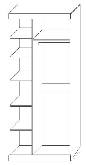 Детали шкафа, которые в эксплуатации подвержены механическим повреждениям, облицованы кромкой ПВХ толщиной 2 мм. Петли без доводчиков, При желании петли с доводчиками можно приобрести дополнительно и самостоятельно установить их. Задняя стенка изготовлена из ХДФ. В левой части шкафа установлены пять несъемных полок из ДСП, в левой части две несъемные полки из ДСП и штанга для одежды. При необходимости левую дверь можно навесить справа, а правую – слева.