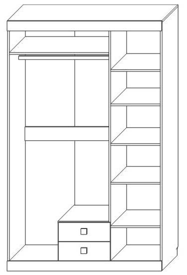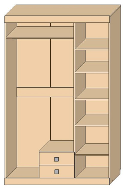 Детали шкафа, которые в эксплуатации подвержены механическим повреждениям, облицованы кромкой ПВХ толщиной 2 мм. Петли без доводчиков, при желании петли с доводчиками можно приобрести дополнительно и самостоятельно установить их. Задняя стенка изготовлена из ХДФ. В левой части шкафа установлена несъемная полка из ДСП, штанга для одежды и два ящика на шариковых направляющих. В правой части установлены пять несъемных полок из ДСП.