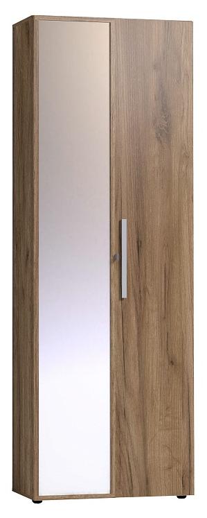 Двухдверный распашной шкаф с одним глухим фасадом и одним зеркальным фасадом в раме. Глухой фасад с серой ручкой из массива, фасад Зеркало Контур открывается за ручку-петлю из высокопрочной микрофибры. Регулируемые опоры компенсируют незначительные неровности пола.