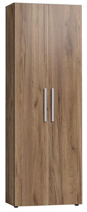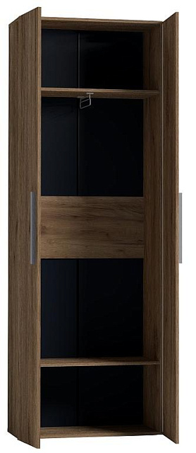 Распашной шкаф с глухими фасадами в декоре Дуб Табачный комплектуется выдвижной штангой для одежды. Глухие фасады с серой ручкой из массива. Регулируемые опоры шкафа помогут компенсировать неровности пола.