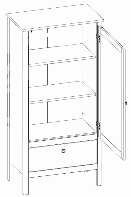 - Тумба разделена на 2 отделения – отделение с полками за распашной глухой дверью и выдвижной ящик;