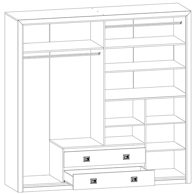 - Шкаф имеет два вертикальных отделения за распашными дверями и отделение с двумя выдвижными ящиками;