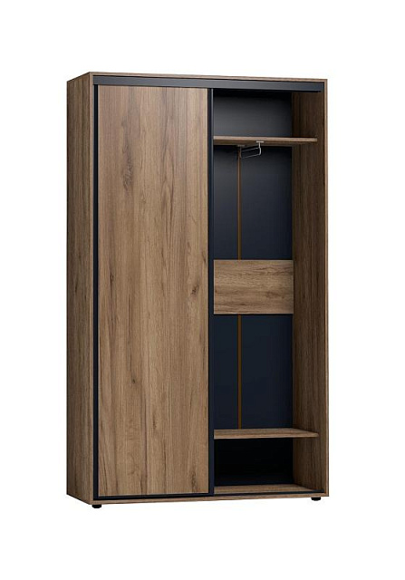 Небольшой шкаф-купе с продуманным внутренним наполнением позволяет рационально использовать площадь небольшого коридора в квартире. В комплектацию шкафа входят: выдвижная штанга и регулируемые по высоте полки для одежды. Два фасада - зеркальный и глухой в декоре Дуб Табачный - перемещаются на стальной системе Найди, которая обеспечивает легкость открывания, плавность и бесшумность хода. Зеркальный фасад проклеен с обратной стороны защитной пленкой. Регулируемые опоры компенсируют незначительные неровности пола.