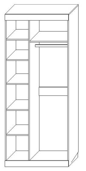 Детали шкафа, которые в эксплуатации подвержены механическим повреждениям, облицованы кромкой ПВХ толщиной 2 мм. Петли без доводчиков, При желании петли с доводчиками можно приобрести дополнительно и самостоятельно установить их. Задняя стенка изготовлена из ХДФ. В левой части шкафа установлены пять несъемных полок из ДСП, в левой части две несъемные полки из ДСП и штанга для одежды. При необходимости левую дверь можно навесить справа, а правую – слева.
