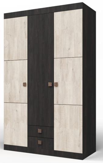 Детали шкафа, которые в эксплуатации подвержены механическим повреждениям, облицованы кромкой ПВХ толщиной 2 мм. Петли без доводчиков, при желании петли с доводчиками можно приобрести дополнительно и самостоятельно установить их. Задняя стенка изготовлена из ХДФ. В левой части шкафа установлена несъемная полка из ДСП, штанга для одежды и два ящика на шариковых направляющих. В правой части установлены пять несъемных полок из ДСП.