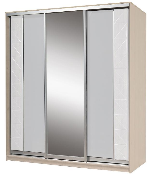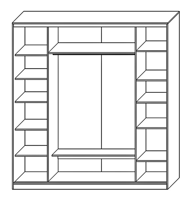 Средняя дверь изготовлена из зеркальной вставки, а правая и левая дверь изготовлена из комбинации стекла эмалит и МДФ пленочного. Стекло эмалированное – это стекло, на одну из поверхностей которого наносится эмалевая краска и после её высыхания стекло подвергается закалке, обладая всеми свойствами безопасного закаленного стекла. Детали шкафа, крышка, боковые стенки, которые в эксплуатации подвержены механическим повреждениям, облицованы кромкой ПВХ. В правой и левой части шкафа за дверями несъемные полки, а в средней части штанга для одежды. Система раздвижения Сенатор обеспечивает плавное и бесшумное скольжение дверей и создаёт эффект парения в воздухе.