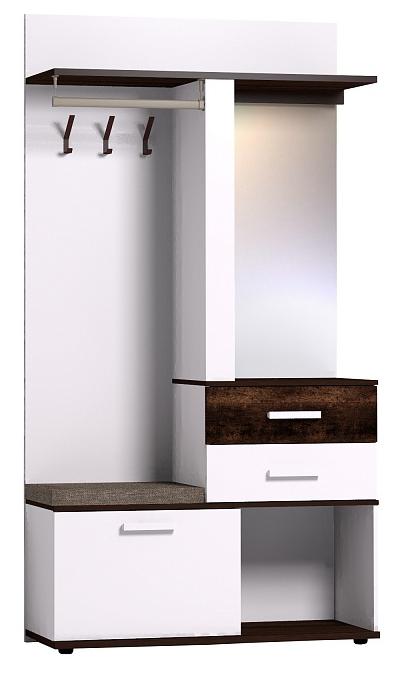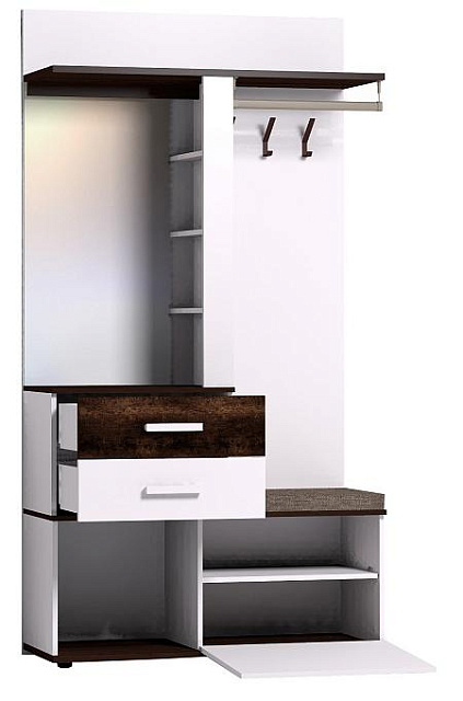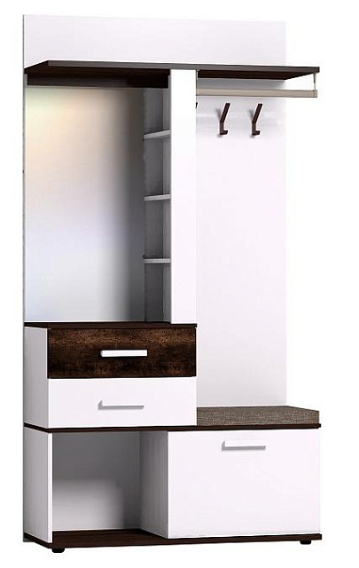 Многофункциональный шкаф Норвуд 70 - находка для маленькой прихожей. В небольшом по габаритам модуле (шириной 1120 мм и глубиной 400 мм) сочетается всё необходимое: крючки, стационарная штанга, открытые полки, выдвижные ящики, отделение за откидным фасадом, открытая ниша, зеркало с подсветкой. Встроенная светодиодная подсветка включается при помощи аккуратного кнопочного выключателя. Откидной фасад дополнительно фиксируется при закрывании магнитной защелкой. Горизонтальные детали толщиной 22 мм в декоре Орех Шоколадный и фасад верхнего ящика из дерева с брашировкой контрастируют с белым декором модуля. В комплектацию входит мягкое сидение, которое позволит обуваться с комфортом. Регулируемые опоры помогут компенсировать неровный пол в прихожей. Собрать Шкаф МЦН можно как на правую, так и на левую сторону.