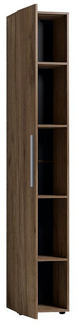 Шкаф для белья поможет подростку рассортировать и держать в порядке свои вещи. Узкий и высокий шкаф-пенал с четырьмя полками, регулируемыми по высоте. Глухой фасад в декоре Дуб Табачный с ручкой из массива цвета серый металлик. Шкаф собирается как на левую, так и на правую сторону. Для надежности рекомендуется крепить шкаф к стене на подвесы.