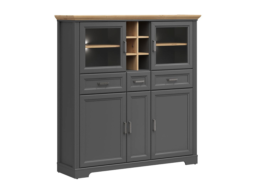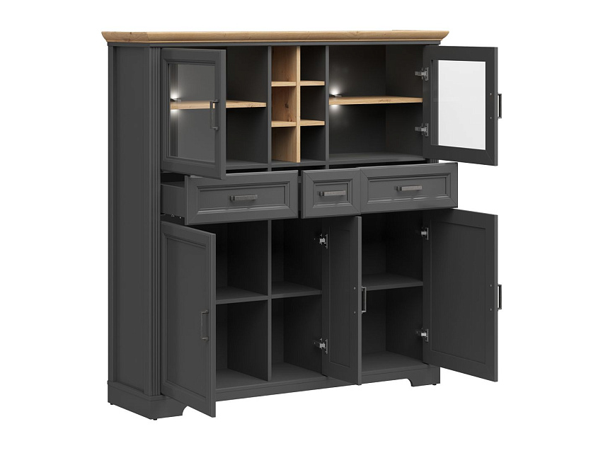 - в верхней части шкафа расположены: 2 отделения для хранения за стеклянными дверями, открытое отделение с ячейками