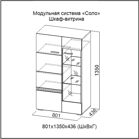 Модуль разделен вертикальной перегородкой на два отделения. Левое отделение комплектуется глухой створкой, двумя стационарными и одной съемной полками. Правое отделение комплектуется составной стеклостворкой с тонированным серым стеклом, двумя стеклянными полками и одной полкой из ЛДСП. Правая ручка устанавливается прямо на стекло, в котором для этого предусмотрены отверстия.