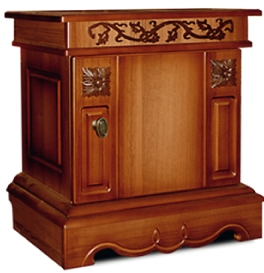 Тумба может быть собрана как левосторонняя, так и правосторонняя (дверь может быть навешена на правую боковую стенку или на левую). Петли без доводчиков, задняя стенка изготовлена из ХДФ. За дверью несъёмная полка. При желании петли с доводчиками можно приобрести дополнительно и самостоятельно установить их. Крышка, стенки боковые, фасад изготовлены из эко-массива и защищены лаком на водной основе. Опорой во всех изделиях служит имитация подиума. Изготавливается в двух цветах дуб молочный и орех экко.
