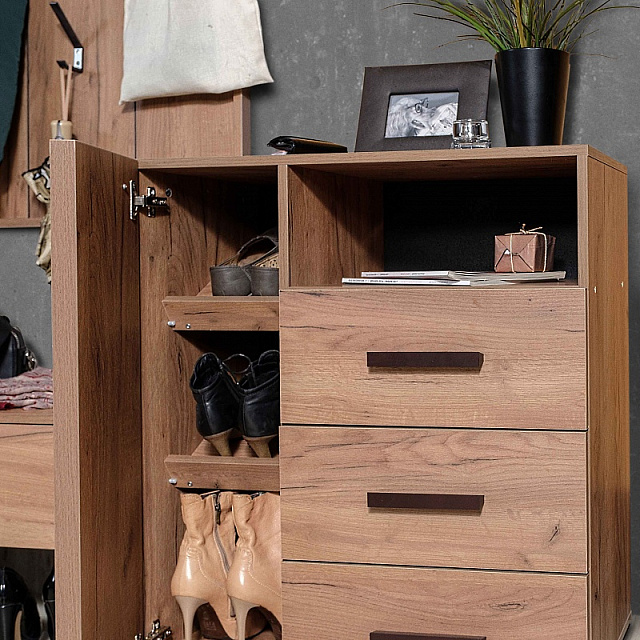 Комбинированная тумба для обуви - удобная и продуманная система хранения обуви для всей семьи. Тумба состоит из трех выдвижных ящиков и отделением за распашной дверцей. За распашным фасадом Контур находятся две полки для хранения обуви, которые находятся наискосок. Полки регулируются по высоте, для этого полкодержатели необходимо установить в подготовленные отверстия. Модуль можно собирать как на левую, так и правую сторону.