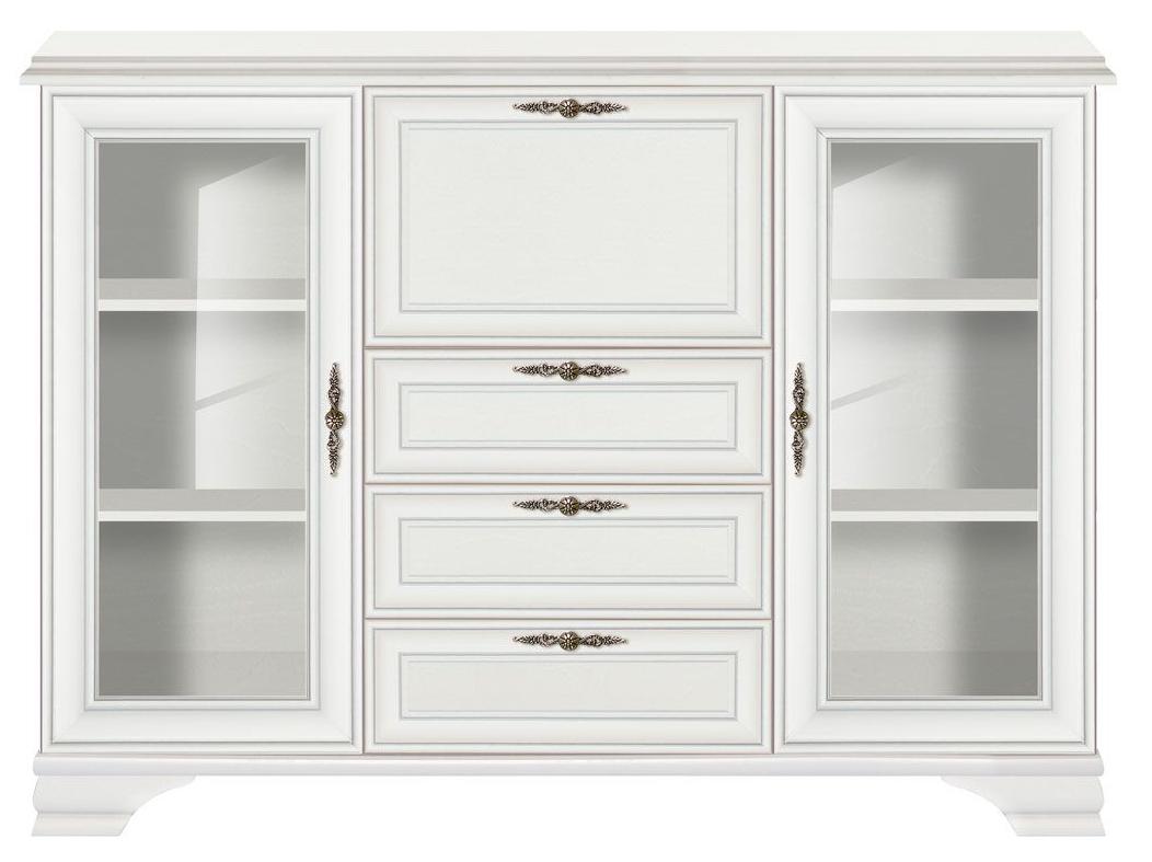 Тумба разделена на 4 отделения: 2 отделения с полками за распашными дверями со стеклянной вставкой, отделение в центральной части за откидной дверью, 3 выдвижных ящика на металлических роликовых направляющих