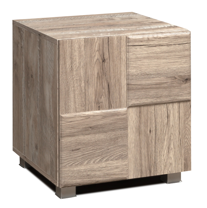 Тумба может быть собрана, как левосторонняя, так и правосторонняя (дверь может быть навешена на правую боковую стенку или на левую). Тумба установлена на четырёх нерегулируемых опорах. Петли без доводчиков, задняя стенка изготовлена из ХДФ. Дверь изготовлена больше корпуса со свесом для удобства открывания. К двери прикреплены декоративные элементы в шахматном порядке из МДФ плёночного. За дверями несъёмная полка. Дверь облицована износостойкой кромкой ПВХ. При желании петли с доводчиками можно приобрести дополнительно и самостоятельно установить их.