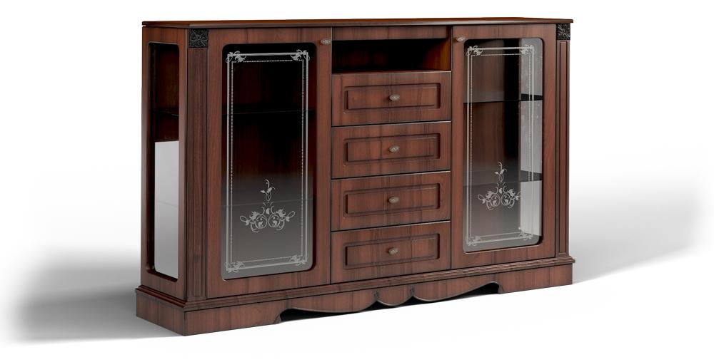 Ящики на шариковых направляющих, петли без доводчиков. Крышка, стенки боковые, накладки ящиков, двери, пыльник изготовлены из эко-массива и защищены лаком на водной основе. Двери с закаленными стеклами с шелкотрафаретной печатью, за ними установлены по две съемные стеклянные полки толщиной 4 мм. и зеркала. Декоративные элементы на фасаде из ПУ. Комод устанавливается на подиум.