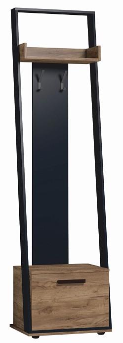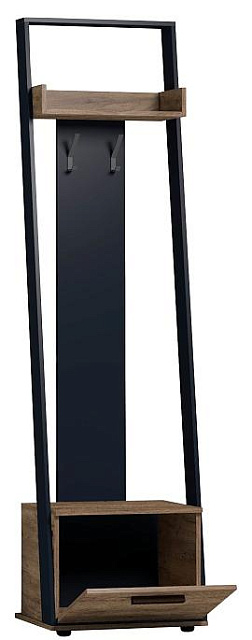 Оригинальная вешалка не займет много места в прихожей, но станет самой яркой деталью вашей входной зоны. Удачная комбинация ЛДСП в декорах Дуб Табачный и Черный является классическим сочетанием современного стиля лофт. Модуль выполняет функции открытой вешалки для верхней одежды и тумбы для обуви. Крепкие металлические крючки способны выдержать нагрузку до 5 кг каждый. Откидной фасад тумбы дополнительно фиксируется при закрывании магнитной защелкой. Регулируемые опоры позволят компенсировать незначительные неровности пола.