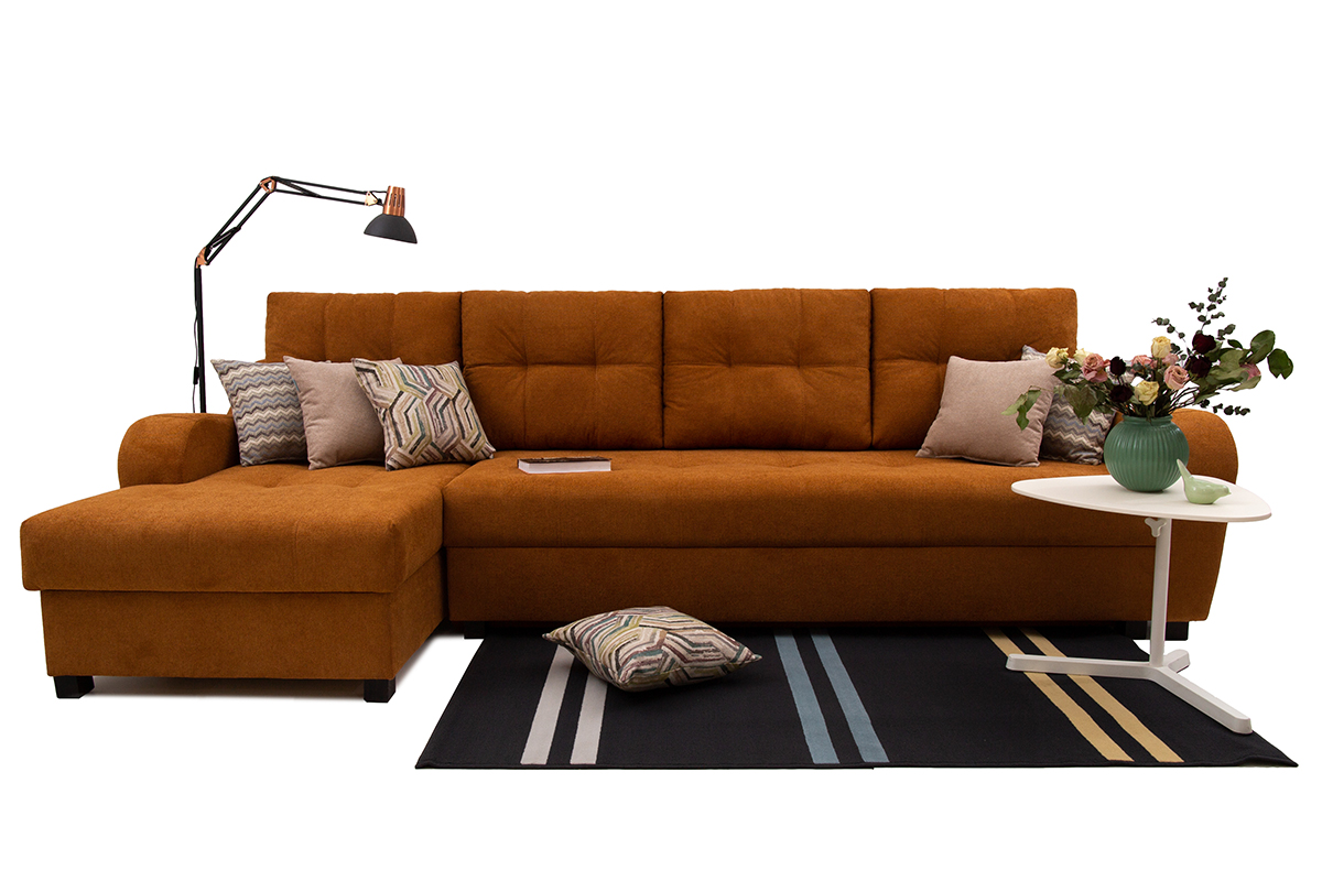 Диван-кровать угловой «Ярослава 1» состоит из длинной секции 1Д и угловой секции с подъемным механизмом 1П с ящиком для хранения. В комплект входят 4 большие и две декоративные подушки. Угол может быть как в правом, так и в левом исполнении.