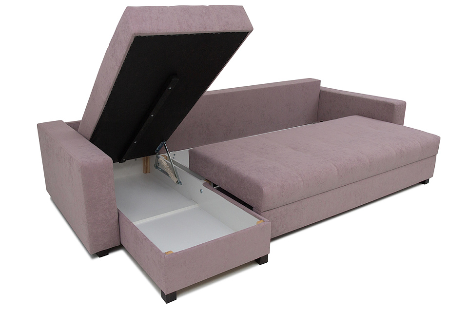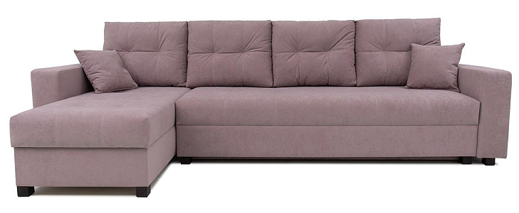 Комплект углового дивана включает в себя длинную секцию 1 Д и угловой модуль с подъемным механизмом 2П с ящиком для хранения постельного белья. Также в комплект входят 2 декоративные подушки. Угловая секция взаимозаменяемая — есть возможность монтажа как справа, так и слева от всей конструкции.