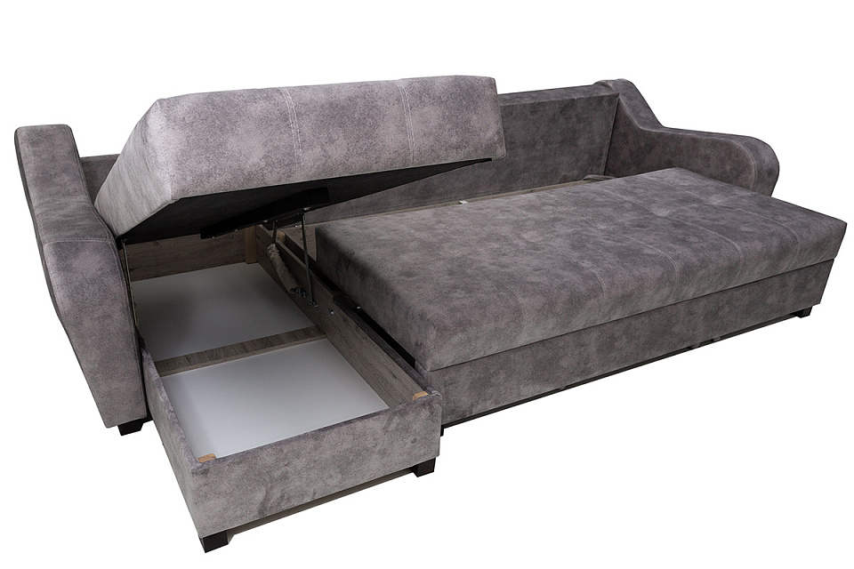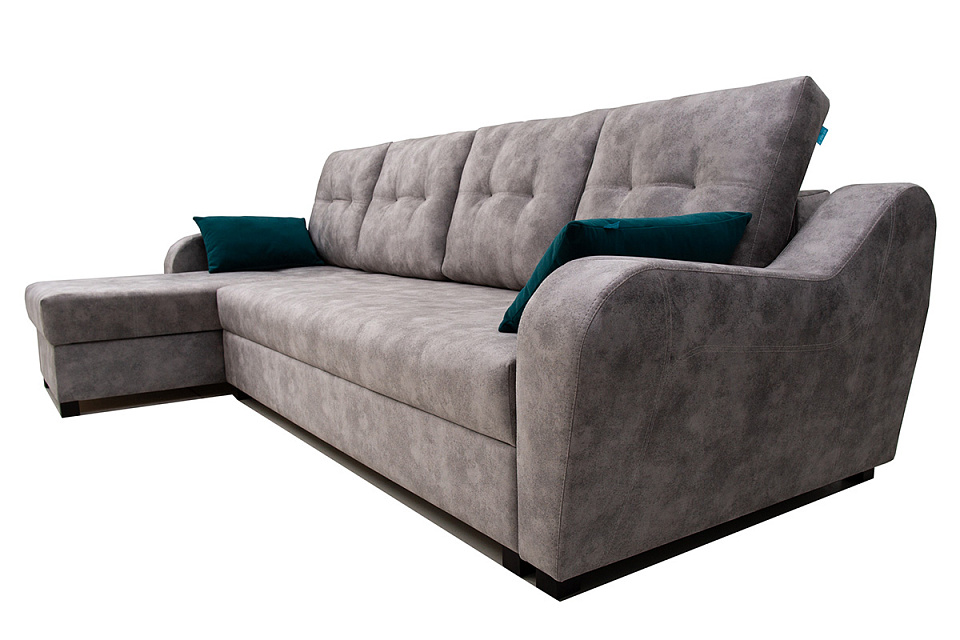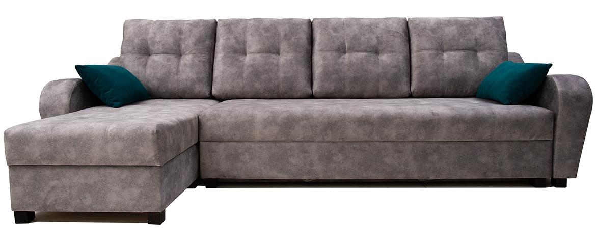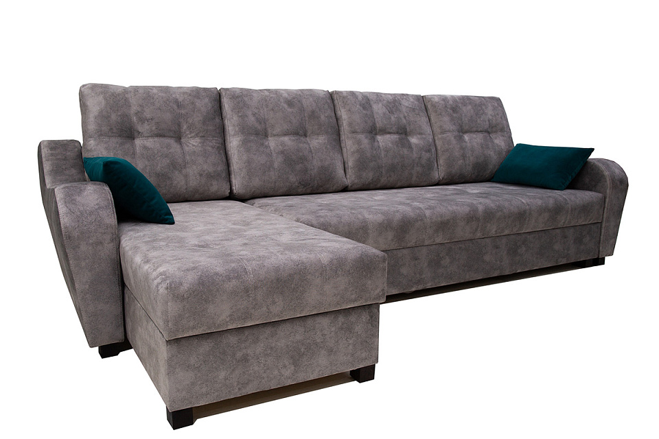 Комплект углового дивана включает в себя длинную секцию 1 Д и угловой модуль с подъемным механизмом 2П с ящиком для хранения постельного белья. Также в комплект входят 2 декоративные подушки. Угловая секция взаимозаменяемая — есть возможность монтажа как справа, так и слева от всей конструкции.